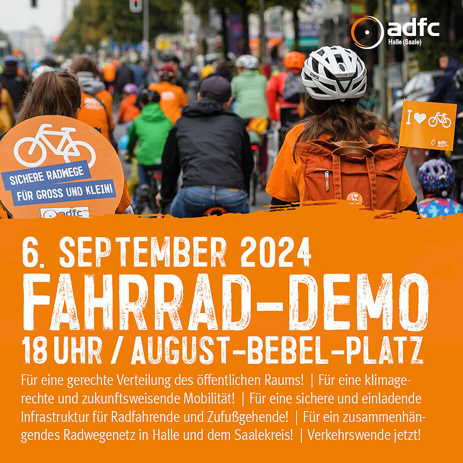 „Lass uns durch die STADTRADELN!“ – unter diesem Motto lädt der ADFC Halle (Saale) am Freitag 6.9.2024 zur großen Fahrraddemo. Start ist 18 Uhr auf dem August-Bebel-Platz.