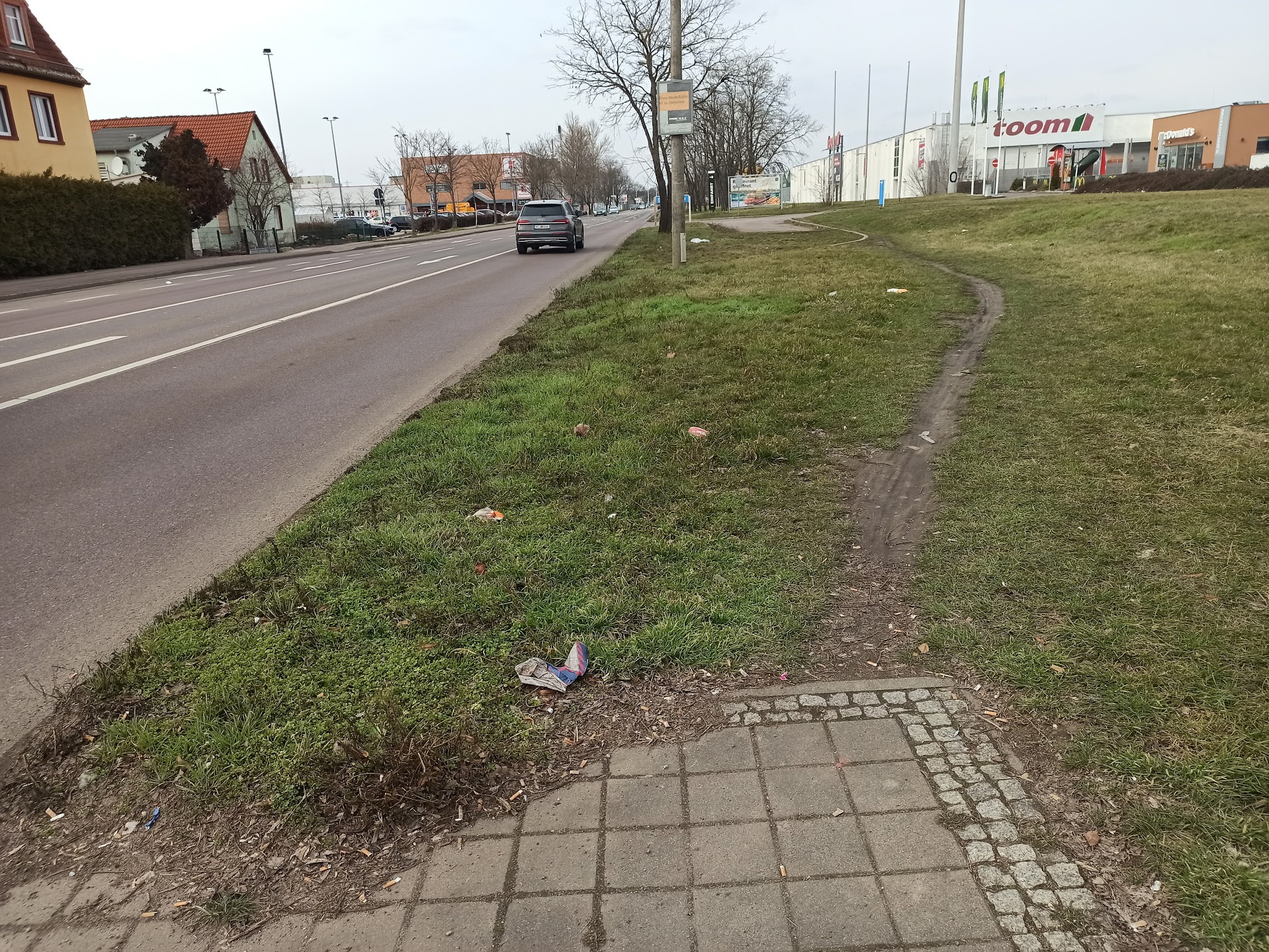 Es fährt ein Rad ins Nirgendwo - auf der Magdeburger Chaussee enden Rad- und Fußweg auf Höhe An der Saalebahn abrupt. Radfahrende fahren lieber in die Grünfläche als auf die Fahrbahn. © ADFC Halle-Saalekreis
